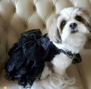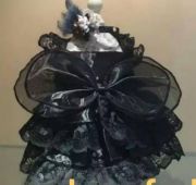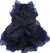Черное кружевное платье с глубоким вырезом-декольте, глубоко вырезаны рукава, украшены кружевом. На талии большой бант. Пышная кружевная юбка с органзой . Застежка впереди на липучках Ваша любимица в таком платье будет выглядеть стильно и и придаст ей шарм