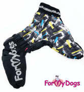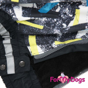 Комбинезон без капюшона из водоотталкивающего полиэстера. Внутри меховой плюш. Застежка-молния на спинке , защищена от промокания. Утягивающие резинки на рукавах, штанишках . На талии утяжки для регулирования объема. Воротник дополнительно фиксируется на кнопку. Модель для собак с широкой грудью( мопсы, французские бульдоги и другие породы с такой же комплекцией) Модель для мальчика ,( с вырезом на животе)
